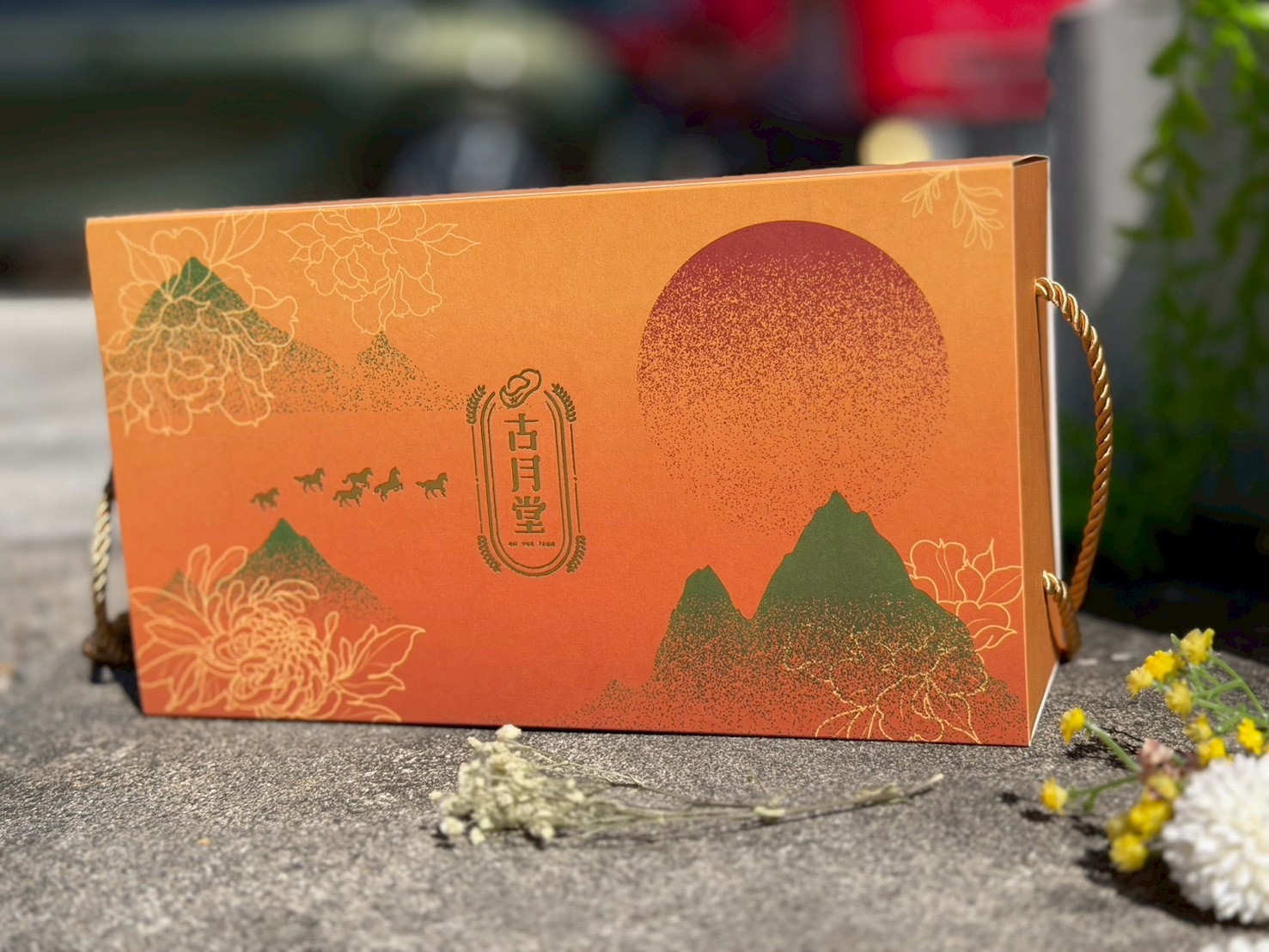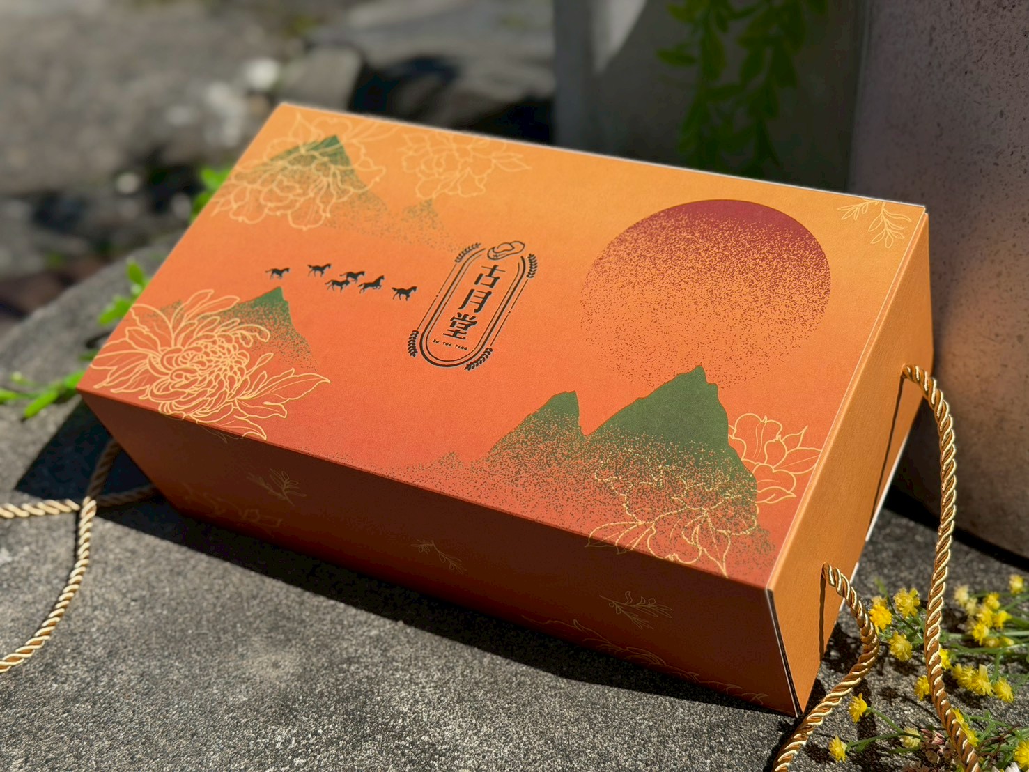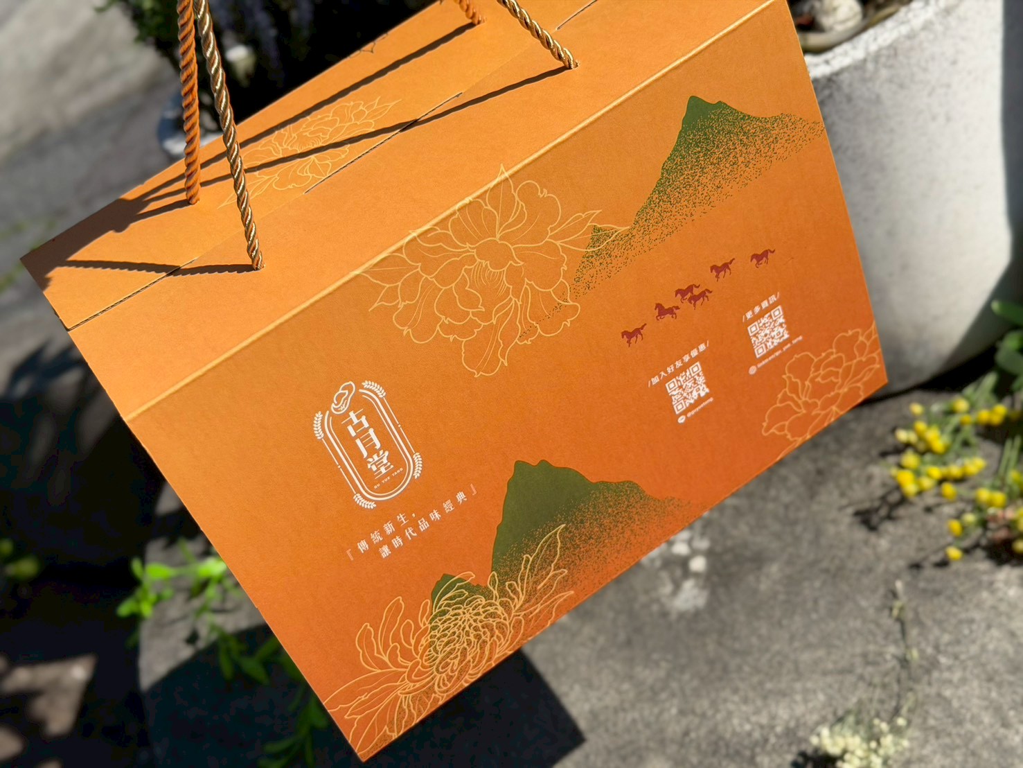 以暖橘漸層搭配山景與奔馬意象,年味滿滿又不老氣🎁
